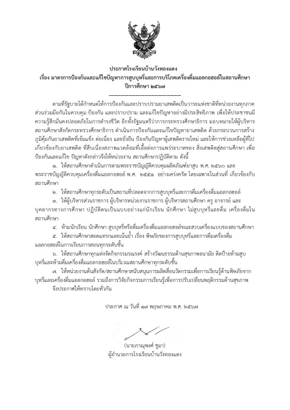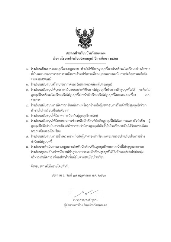 ประกาศนโยบายโรงเรียนปลอดบุหรี่/บุหรี่ไฟฟ้า และเครื่องดื่มแอลกอฮอล์