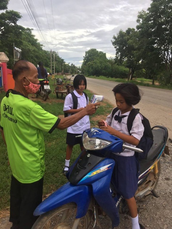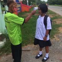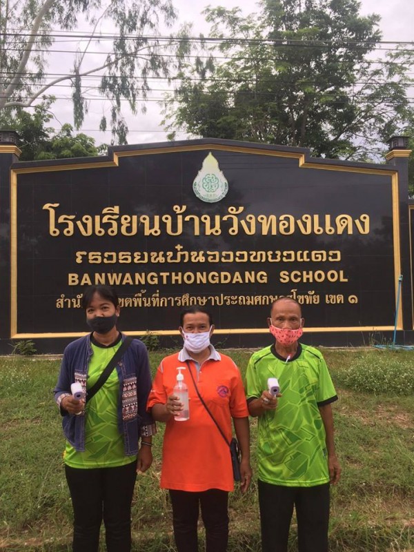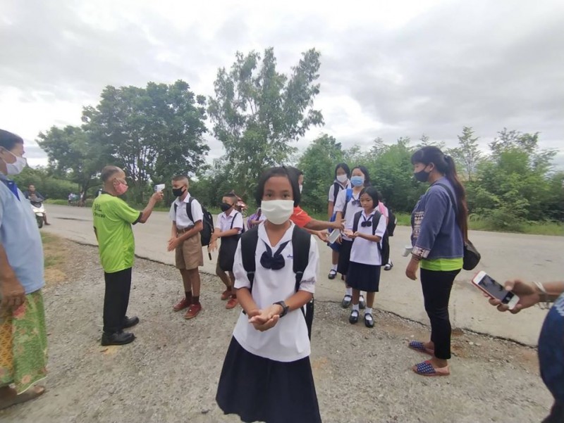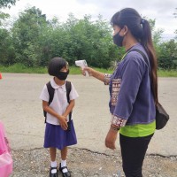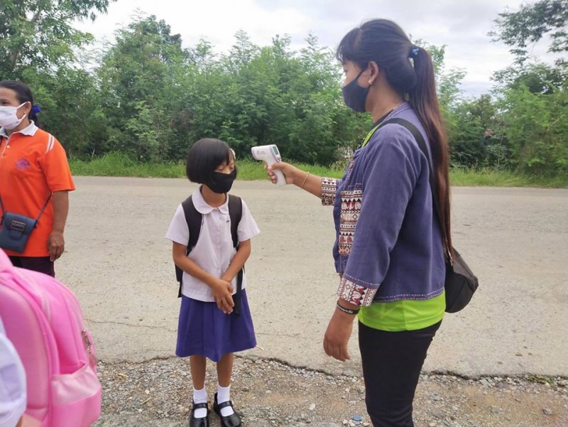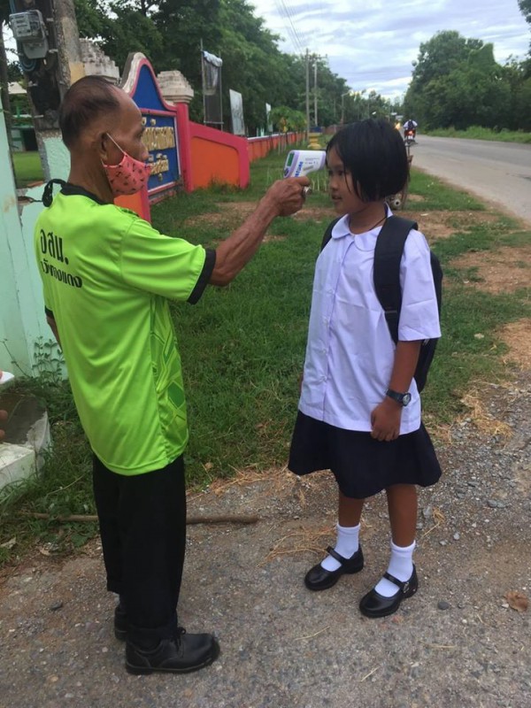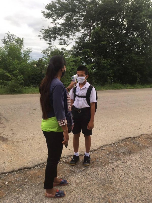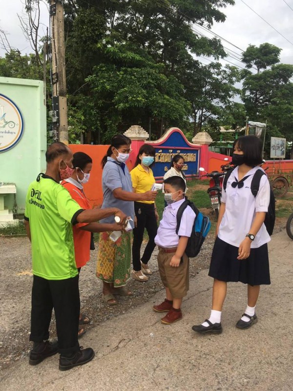 เปิดภาคเรียนปีการศึกษา 2563 ตรวจคัดกรองเชื้อโรคบริเวณหน้าโรงเรียน โดยครูเวรประจำวันและอาสาสมัครสาธารณสุขหมู่บ้าน