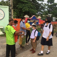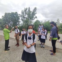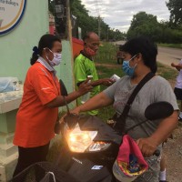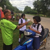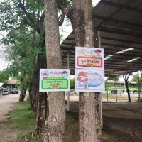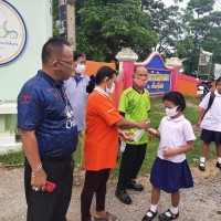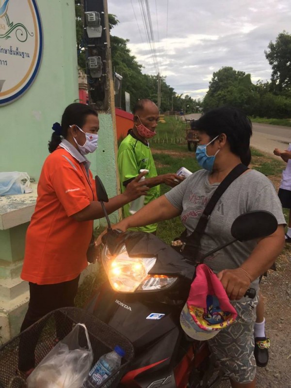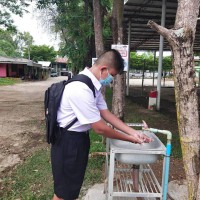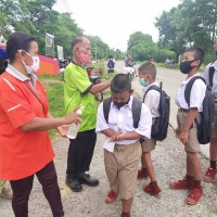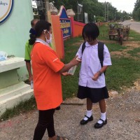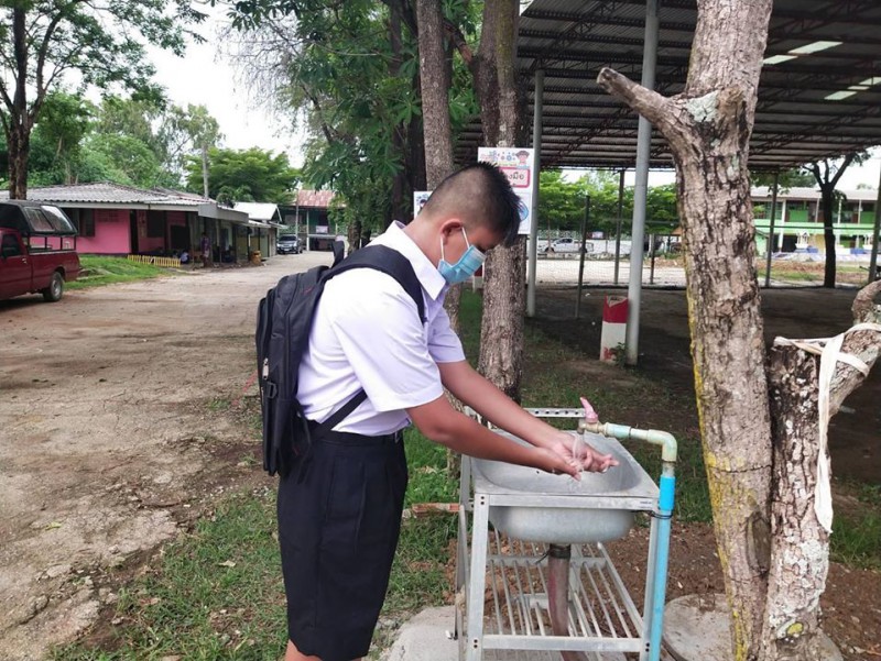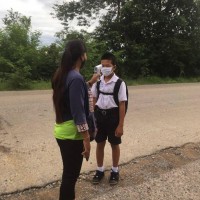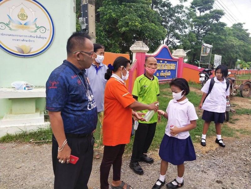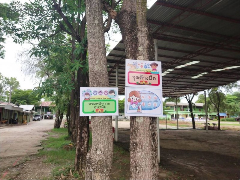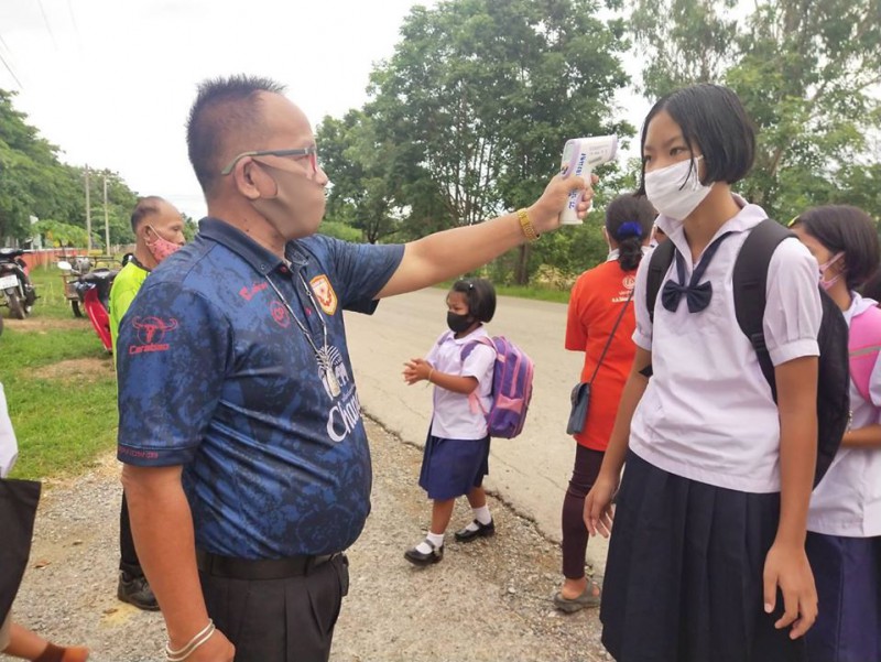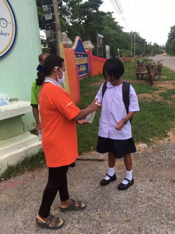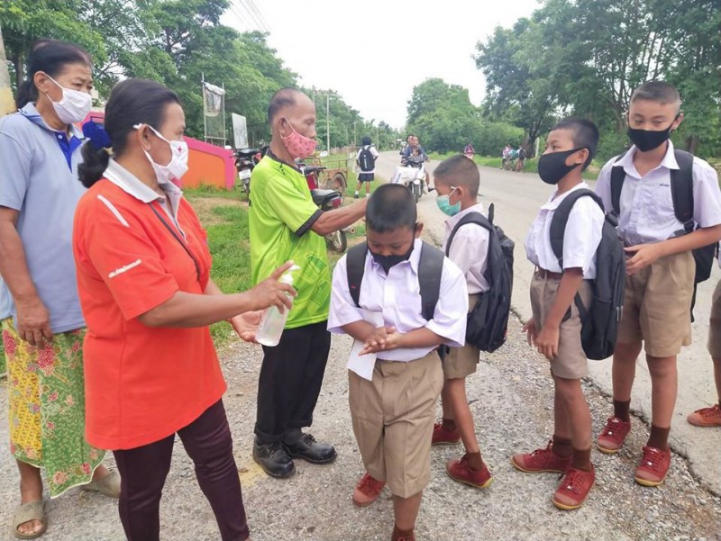 เปิดภาคเรียนปีการศึกษา 2563 ตรวจคัดกรองเชื้อโรคบริเวณหน้าโรงเรียน โดยครูเวรประจำวันและอาสาสมัครสาธารณสุขหมู่บ้าน