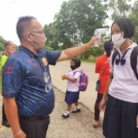 เปิดภาคเรียนปีการศึกษา 2563 ตรวจคัดกรองเชื้อโรคบริเวณหน้าโรงเรียน โดยครูเวรประจำวันและอาสาสมัครสาธารณสุขหมู่บ้าน