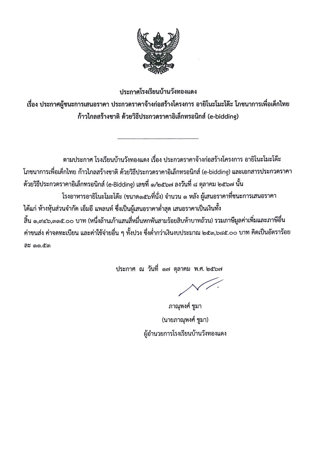 ประกาศโรงเรียนบ้านวังทองแดง เรื่อง ประกาศผู้ชนะการเสนอราคา การประกวดราคาจ้างก่อสร้างโครงการ อายิโนะโมะโต๊ะ โภชนาการเพื่อเด็กไทย ก้าวไกลสร้างชาติ ด้วยวิธีประกวดราคาอิเล็กทรอนิกส์ (e-bidding)