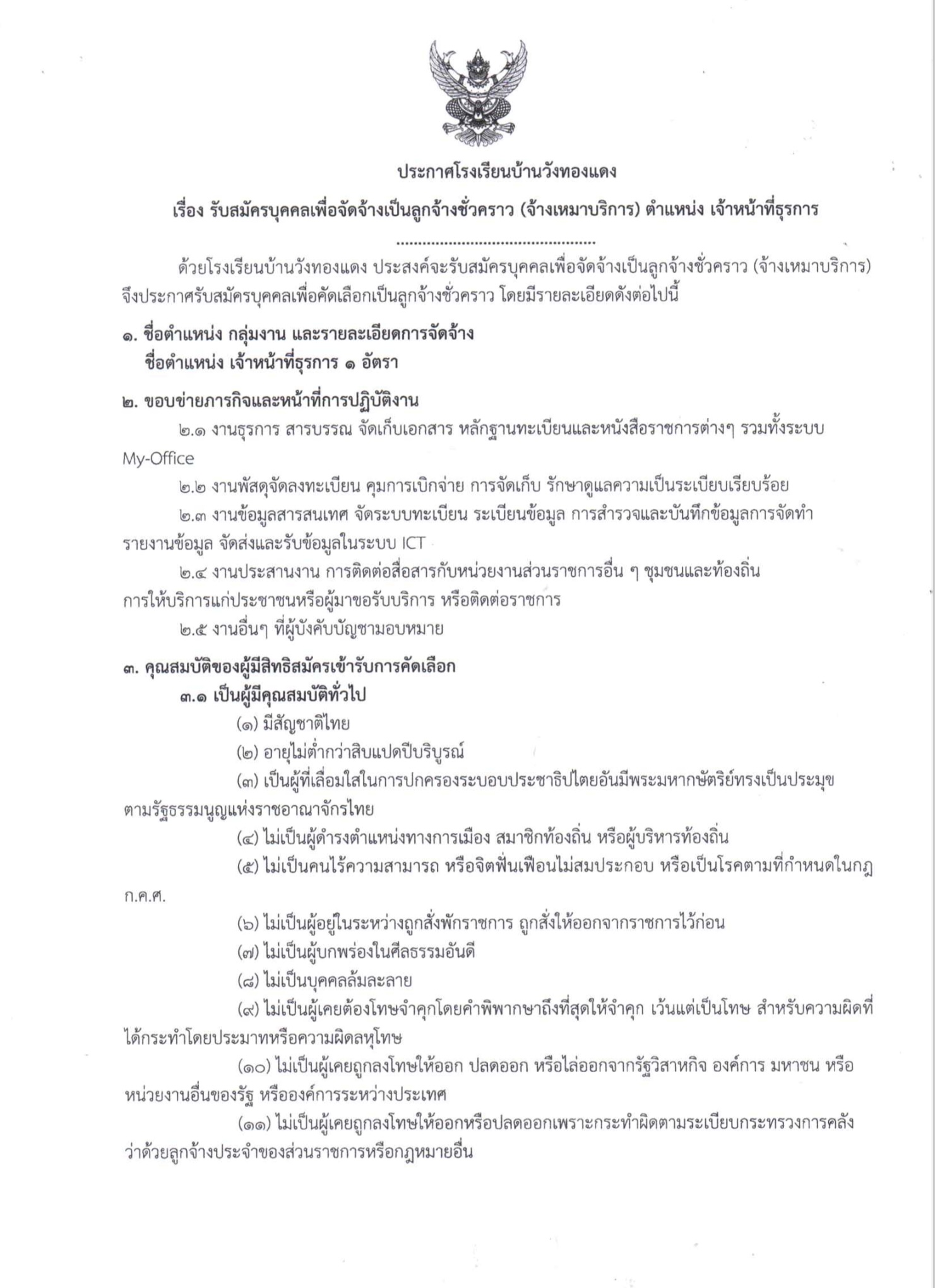 ประกาศรับสมัคร ธุรการ โรงเรียนบ้านวังทองแดง จำนวน 1 อัตรา