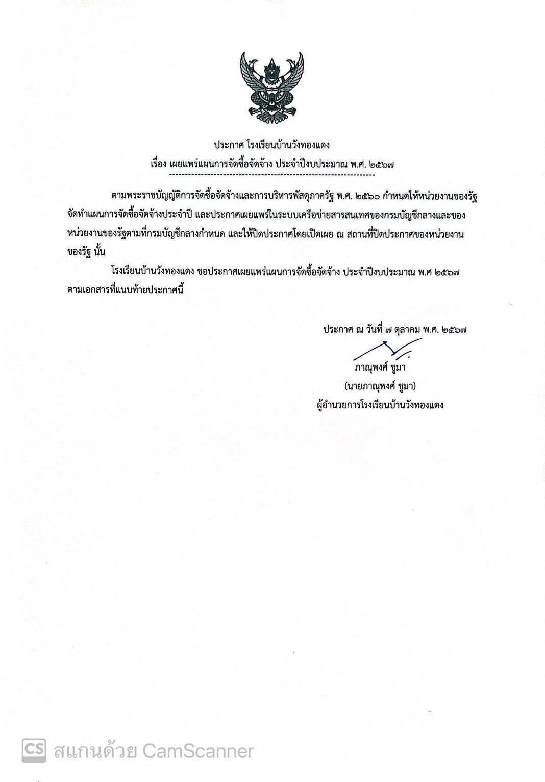 ประกาศโรงเรียนบ้านวังทองแดง เรื่อง เผยแพร่แผนการจัดซื้อจัดจ้าง ประจำปีการศึกษา พ.ศ. 2567